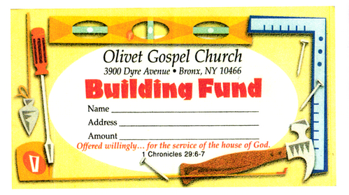 After you submit your pledge card, it is time to give towards your pledged amount. Please use the Building Fund envelopes for your pledged giving. Below is an example of the Building Fund envelopes. Please ask our ushers if you do not have building fund envelopes. These envelopes make it easier for us to distinguish your giving towards the building fund versus your usual tithe and offering.
